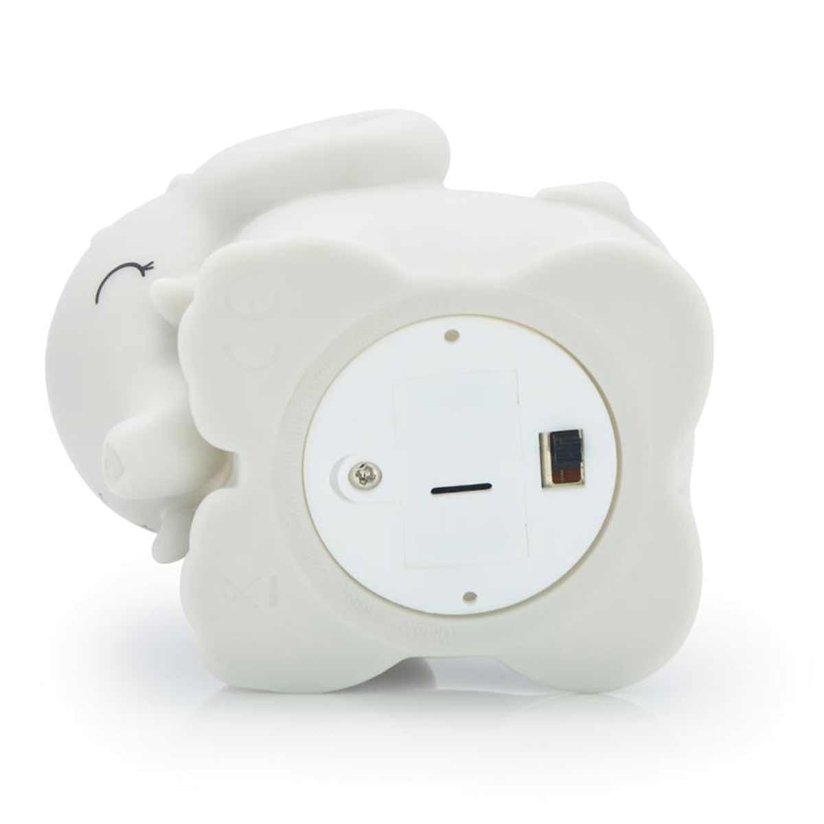 LED Elephant Night LightScrolling multicolor light- LED light- Regular Mode- Timer mode: turns off after 15 minutes- ON/OFF switch under the unicorn- Runs on batteries: 3 LR44 (included)- PVCDimensions: 9 x 7 x 7 cm
