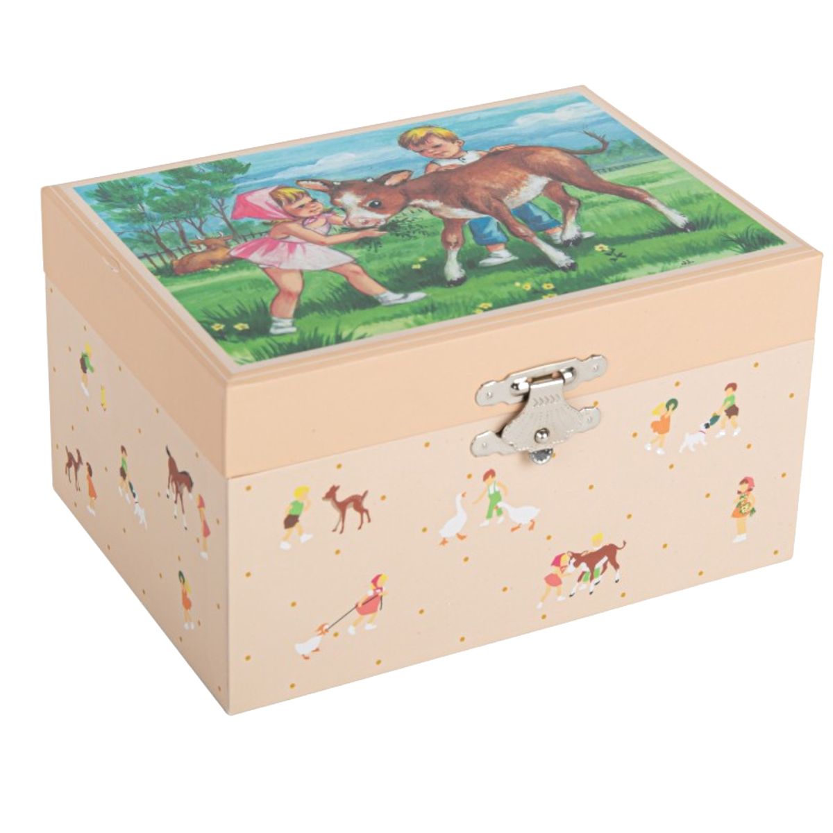 Musical jewelry box Young Cow - Childhood Memory of Jeanne LagardeA small horse figurine turnsA drawer + jewelry storageOperates without battery using a mechanical winder.The melody starts when you open the box and stops when you close it.This item is not a toyDim: 15 x 10.5 x 8.5 cmMelody: Le Printemps de Vivaldi - Empty livery