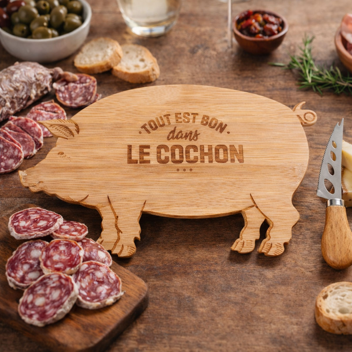Bamboo Charcuterie Board Pig Shape Everything is good in the pig – Serving Board with Knife – 34 x 20 cm – STC• Manufacturer: STC• Material: bamboo• Dimensions: depth 20 cm × width 34 cm × height 1 cm• Set including serving board and knife• Main colour: natural woodThis set includes an original bamboo serving board cut in the shape of a pig and engraved with the phrase "Everything is good in the pig".Perfect for serving cured meats, sausages, cheese or tapas during a friendly aperitif with friends or family.Made from bamboo, the board combines durability and natural style. Its playful shape adds character and warmth to your table.The set also includes a cheese knife for easy slicing and serving.