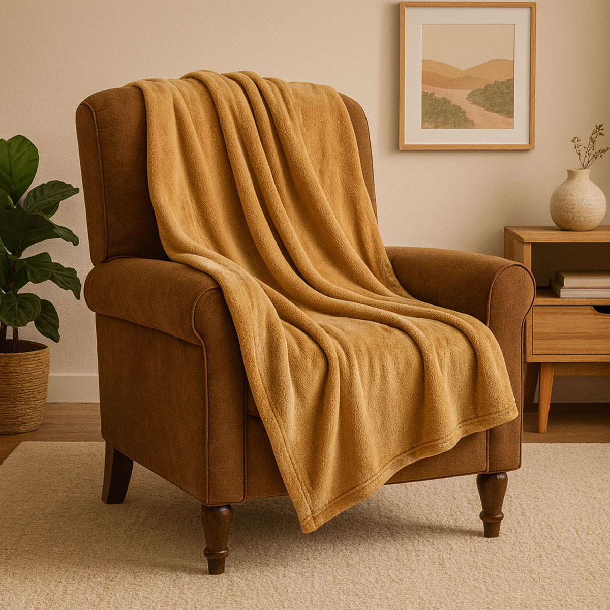 Camel fleece throw blanket 130 × 160 cmAdd a warm and elegant touch to your home with this camel-colored fleece throw blanket. Its ultra-soft texture wraps you in comfort, perfect for relaxing on the sofa, in the bedroom, or keeping warm on winter evenings. Lightweight, practical, and easy to care for, it will quickly become an everyday essential.Features:• Dimensions: 130 × 160 cm• Material: 100% polyester