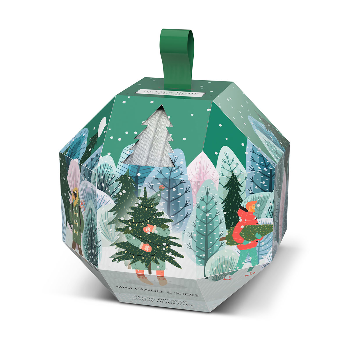 Candle & Socks Gift Set Christmas Tree – Heart and Home Enjoy a cozy moment with this gift set combining a Christmas Tree scented candle and a pair of soft, comfortable socks. An original gift idea that blends well-being, warmth and festive fragrance. A wintery and woody fragrance • Top notes: fresh pine • Heart notes: golden honey • Base notes: cedarwood Features: • Brand: Heart and Home • Collection: Christmas Tree – Pine, golden honey & cedarwood • Contents: 1 scented candle 45 g + 1 pair of socks (approx. size 36-40) • Gift box dimensions: 11.5 × 11.5 × 11.5 cm • Candle dimensions: Height 7 cm × Diameter 5.5 cm • Burn time: up to 15 h • Candle composition: natural soy wax, cotton wick, glass container • Socks composition: 98% polyester, 2% elastane Ingredients (candle): ⚠️ Harmful to aquatic life with long lasting effects. May cause an allergic reaction. Contains: 2,4,6-Trimethylcyclohex-3-ene-carbaldehyde, Iso E Super, Triplal, d-Carvone, d-Limonene. Advice & precautions: • Remove packaging before use • Place the candle on a flat, stable, heat-resistant surface • Glass may become hot during use • Do not move the candle until cooled • Do not burn until the end
