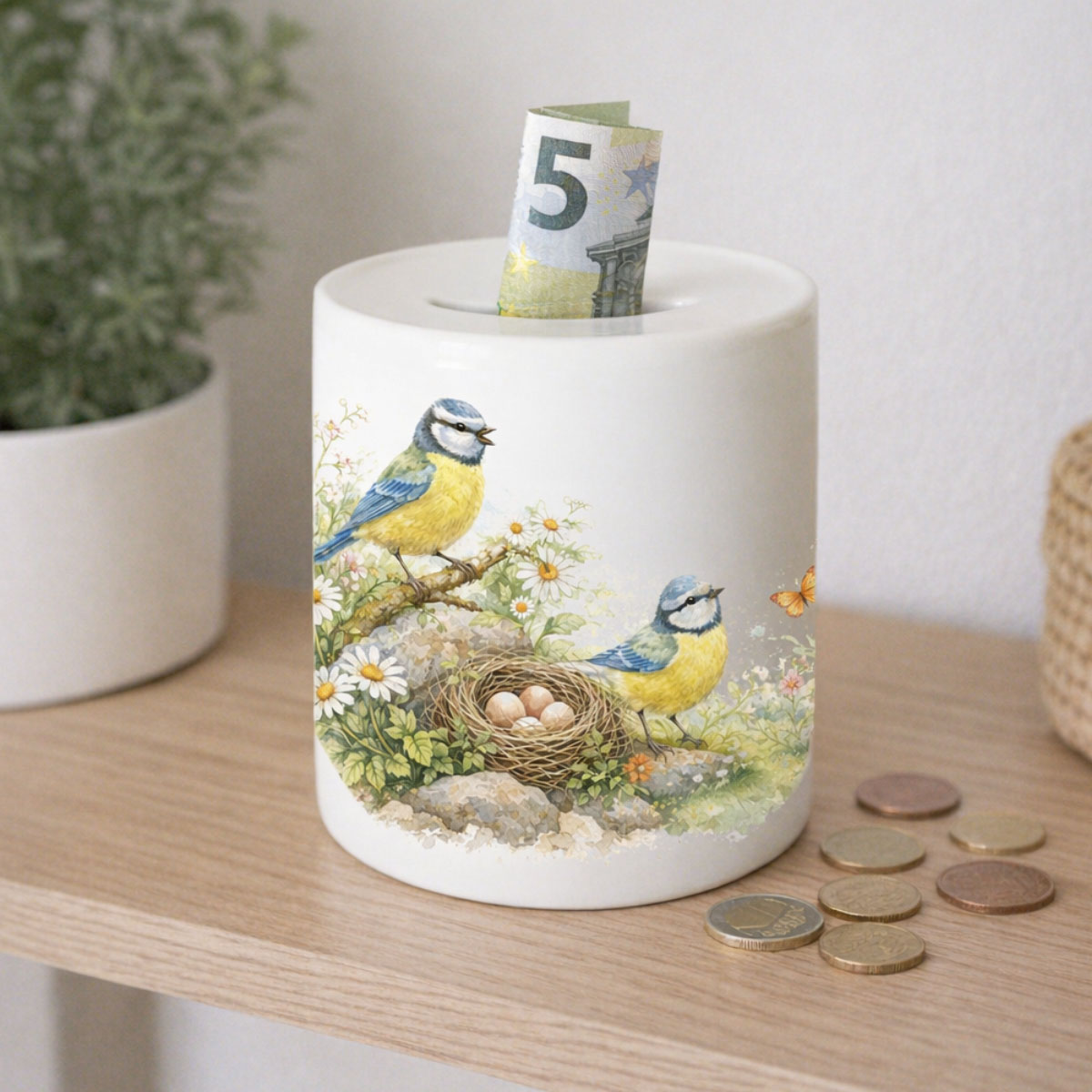 Ceramic Blue Tit Piggy Bank for Children – 9.5 cm with stopper – Printed in France – Baby Room Decoration – CBKréation• Manufacturer: CBKréation• Material: Ceramic with glossy finish• Dimensions: Height 9.5 cm × Diameter 8 cm• Opening: Stopper under the piggy bank for easy savings retrieval• Use: Decorative piggy bank for a baby’s or child’s room – Ideal gift for birth or birthday• Design printed in FranceThis ceramic blue tit piggy bank gently helps children learn to save their first coins. Its poetic, nature-inspired illustration brings a warm touch to a child’s room decor. The slot on the top allows coins and small bills to be inserted, while the stopper underneath provides simple and practical access without breaking the piggy bank. Its compact size makes it ideal for a shelf, dresser, or desk. The design is printed in France for a bright and refined finish.