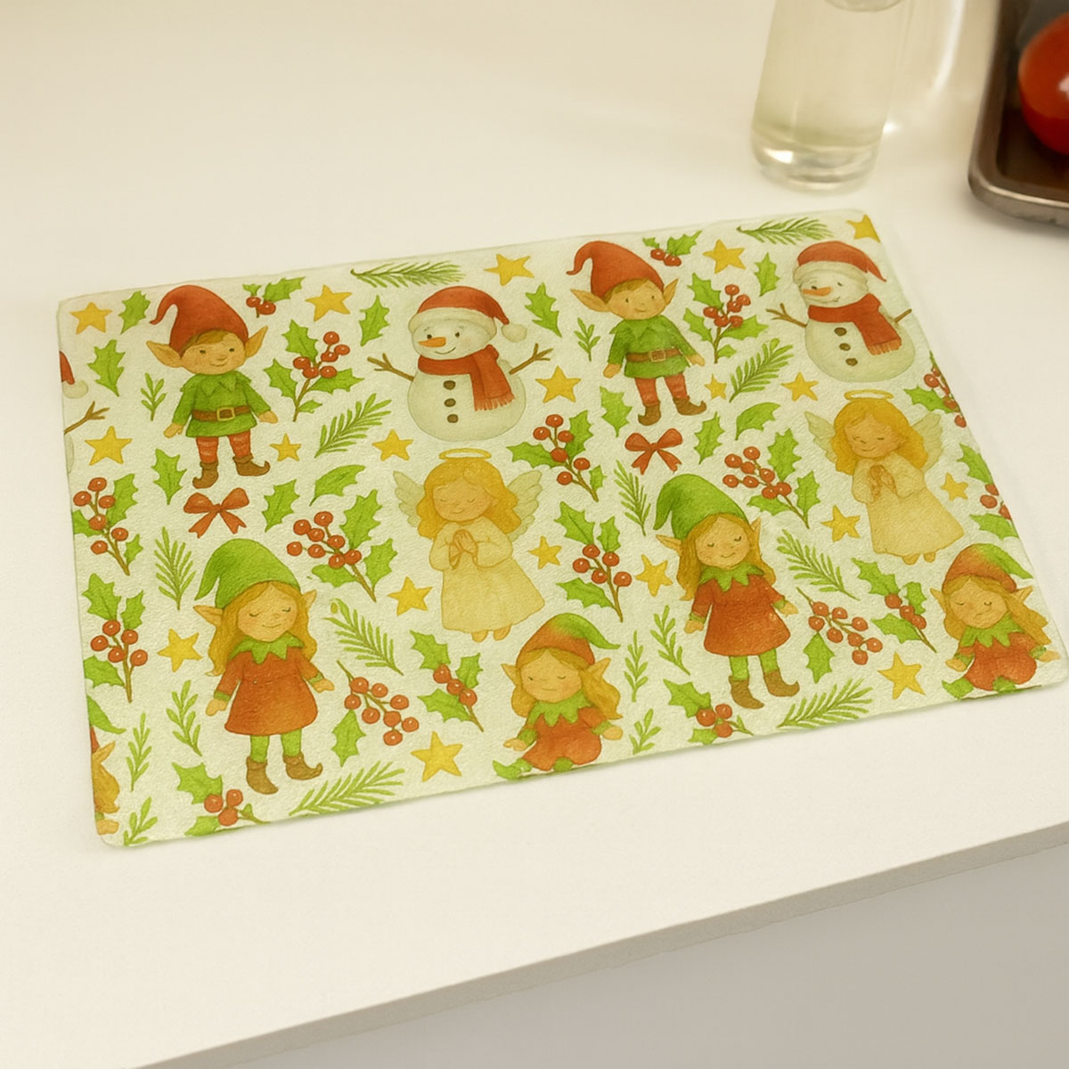 Christmas characters glass cutting boardAdd a magical touch to your cooking with this cutting board decorated with elves, angels and snowmen. Both practical and decorative, it can also be used as a festive tray for your treats and holiday appetizers.Features:• Material: textured glass• Dimensions: width 28.5 cm × depth 20 cm• Printed in France