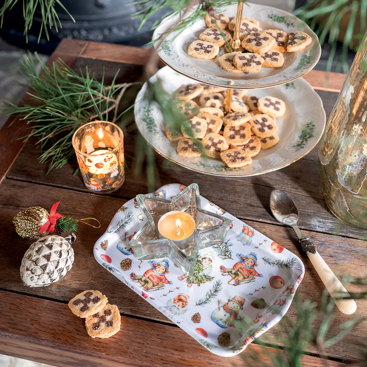 Christmas mini tray – Children and snowman – Ambiente A charming festive tray featuring watercolor winter scenes: children, snowmen and pine branches. Perfect for serving coffee or decorating your holiday table. • brand Ambiente • melamine material • 20.5 × 13.5 cm • hand wash recommended