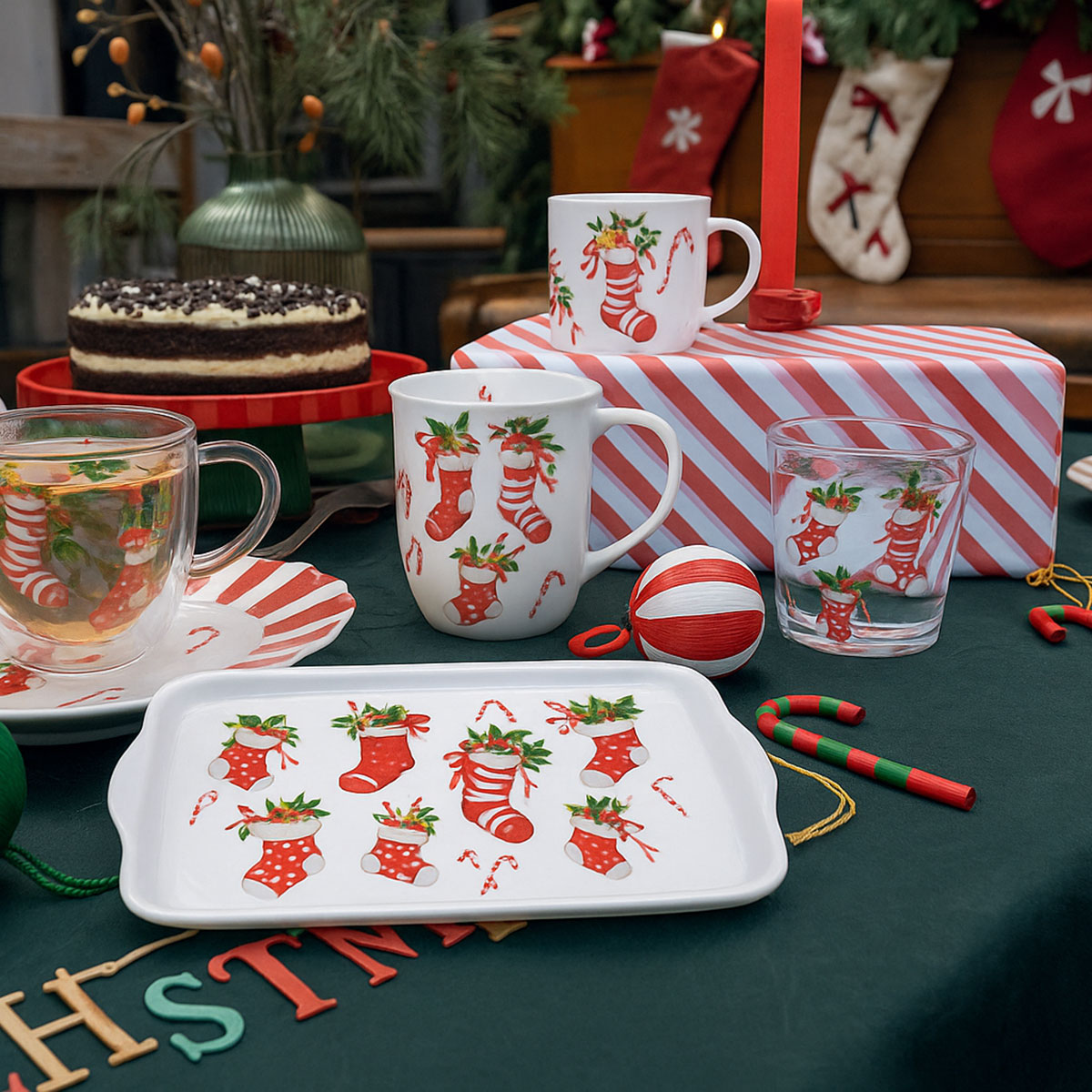 Christmas mini tray – Festive red stockings – Ambiente A cheerful and colorful tray featuring red and white Christmas stockings filled with sweets and winter greenery. Lightweight, durable and perfect for serving or decorating your holiday table. • brand Ambiente • glossy melamine material • 20.5 × 13.5 cm • hand wash recommended