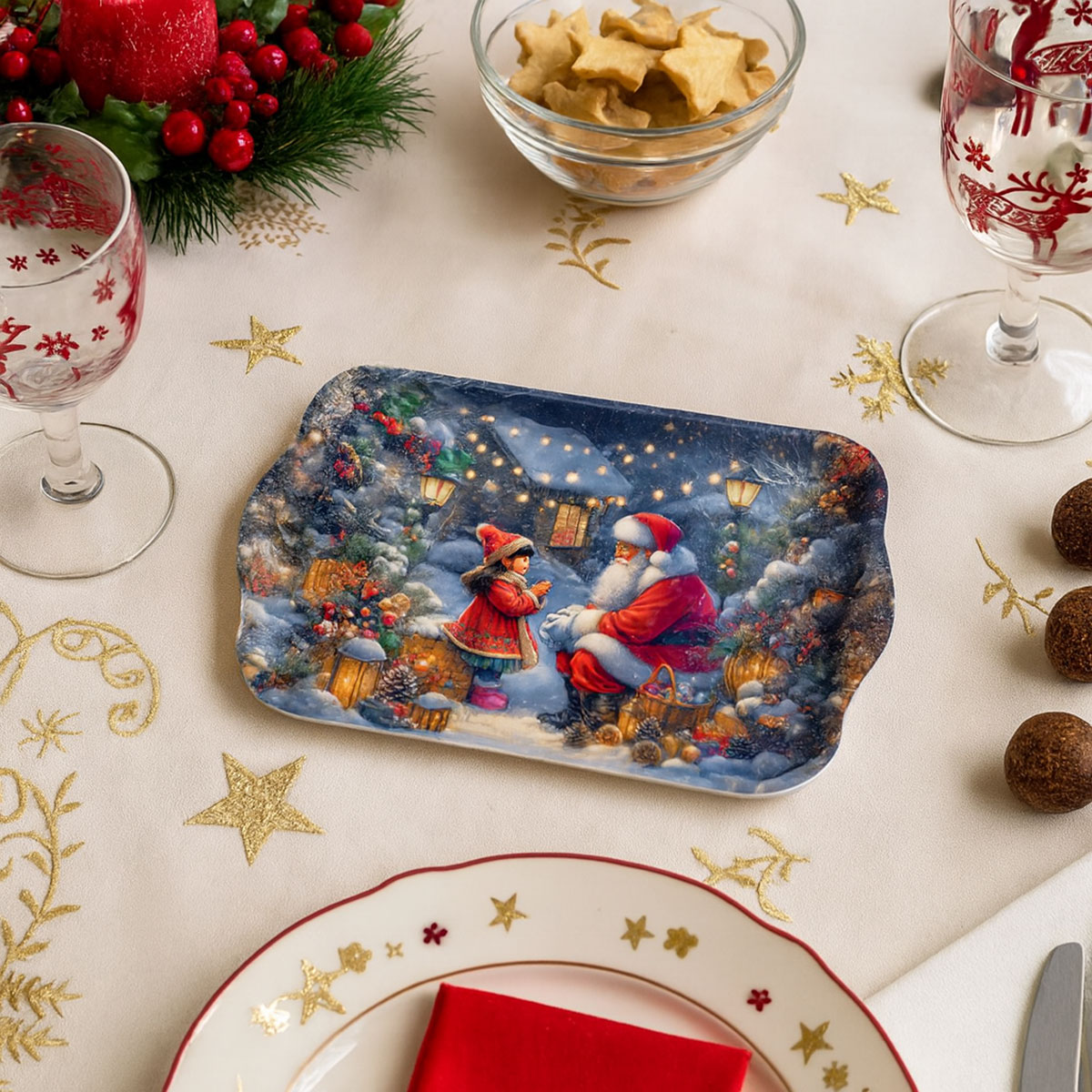 Christmas mini tray – Santa’s encounter – Ambiente A magical winter scene featuring Santa Claus and a little girl in a snowy garden under twinkling lights. Lightweight, durable and perfect for serving or decorating your festive table. • brand Ambiente • glossy melamine material • 20.5 × 13.5 cm • hand wash recommended