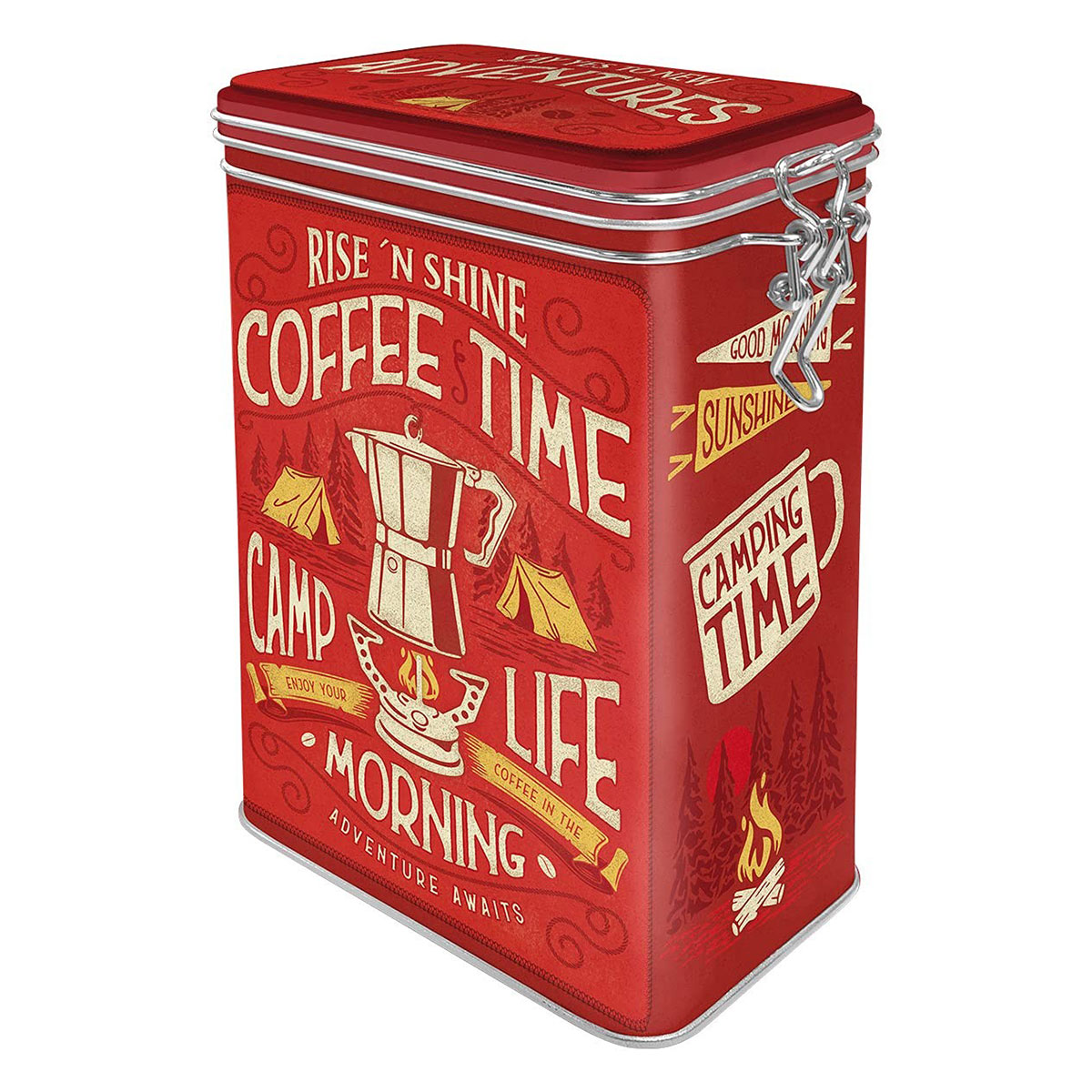 Coffee Time Airtight Tin – Nostalgic-ArtBring a camping and adventure spirit into your kitchen with this retro metal coffee tin inspired by outdoor mornings.- Manufacturer: Nostalgic-Art- Material: robust metal- Airtight clip closure- Size: 17.5 × 11 × 7.5 cm- Ideal for coffee beans or ground coffee- Also suitable for tea, sugar or herbal infusions