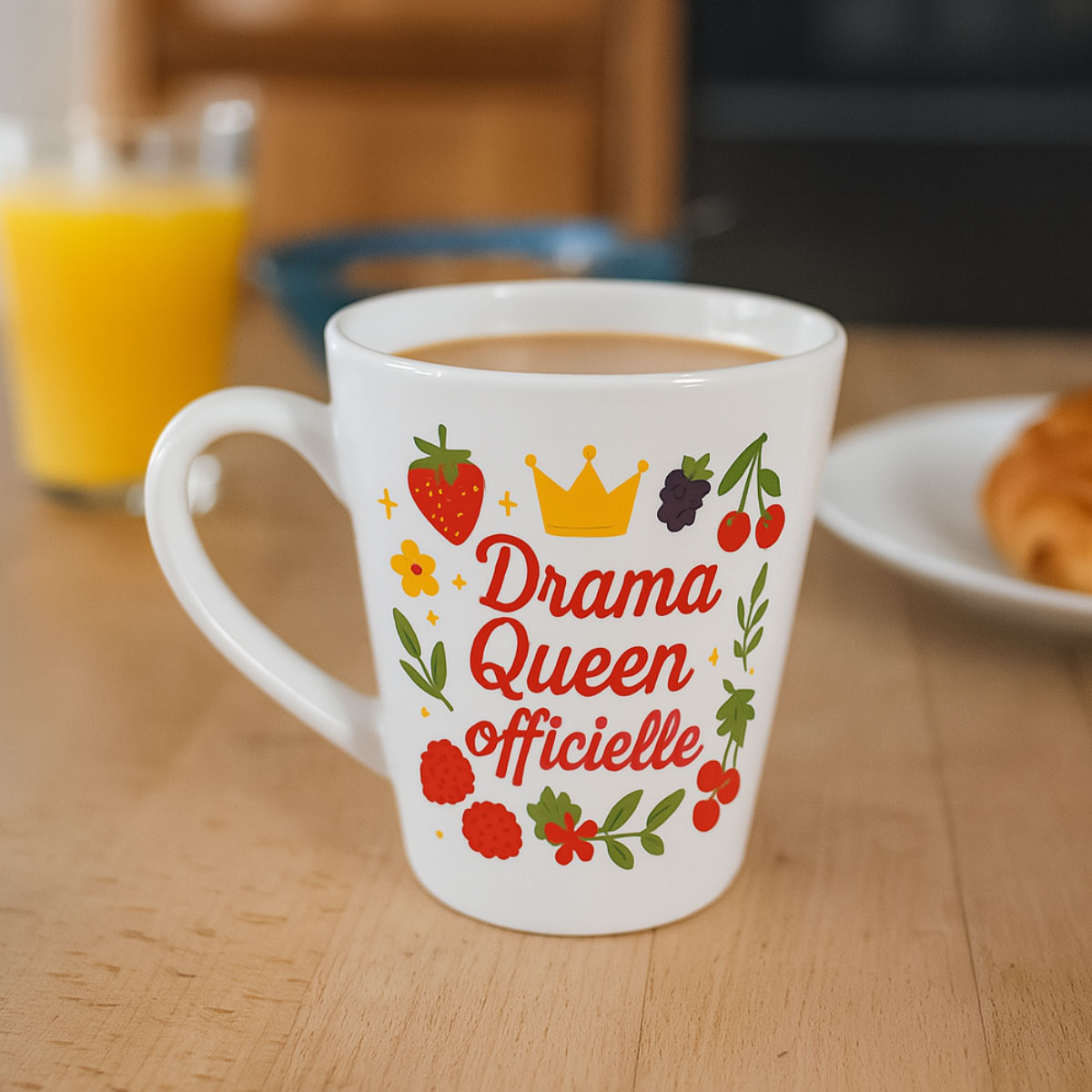 Conical mug Drama Queen officielle 320 ml – Ceramic – Printed in FranceA fun and expressive mug for women who live their emotions in full drama and great style.Product details:- Manufacturer: CBKréation- Material: Ceramic- Dimensions: Diameter 9 cm × Height 10 cm- Capacity: 320 ml- Printing: Made in France- Shape: Conical mug