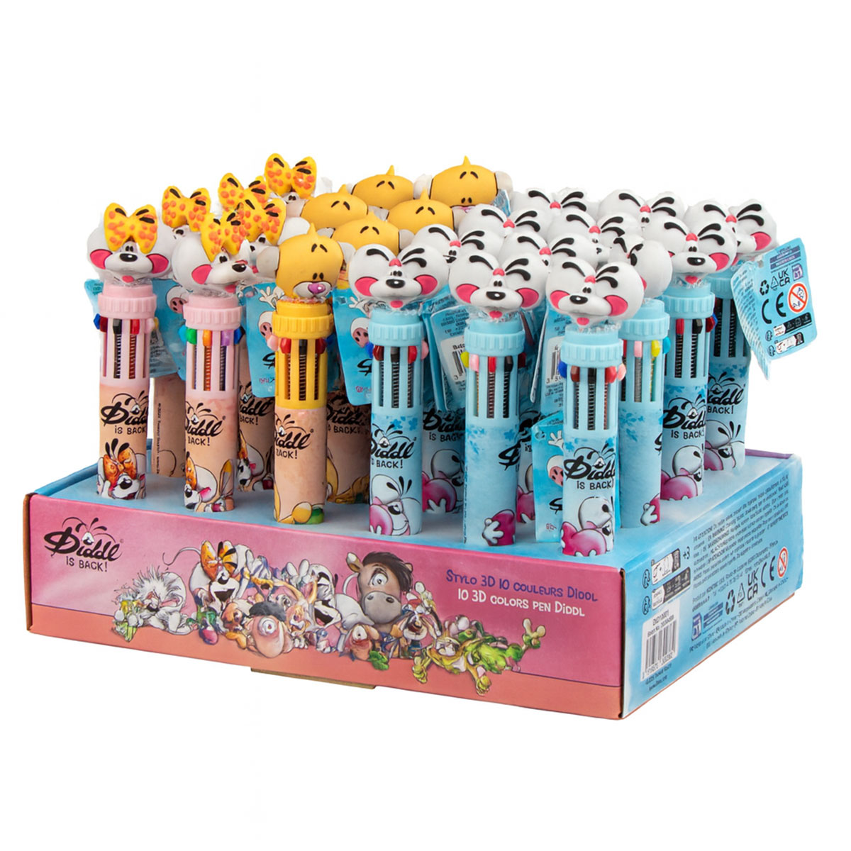 Diddl 3D 10-Color Pen – Random Model • 10 ink colors: blue, red, green, pink, purple, black, orange, yellow, turquoise, brown • 3 models available: Diddl (blue), Diddlina (pink), Pimboli (yellow) • Change color with a single click • Cute 3D character topper • Official Diddl is Back collection • Dimensions: Ø 2 cm × H 15 cm ⚠️ Random model shipped depending on stock availability (cannot be chosen when ordering)