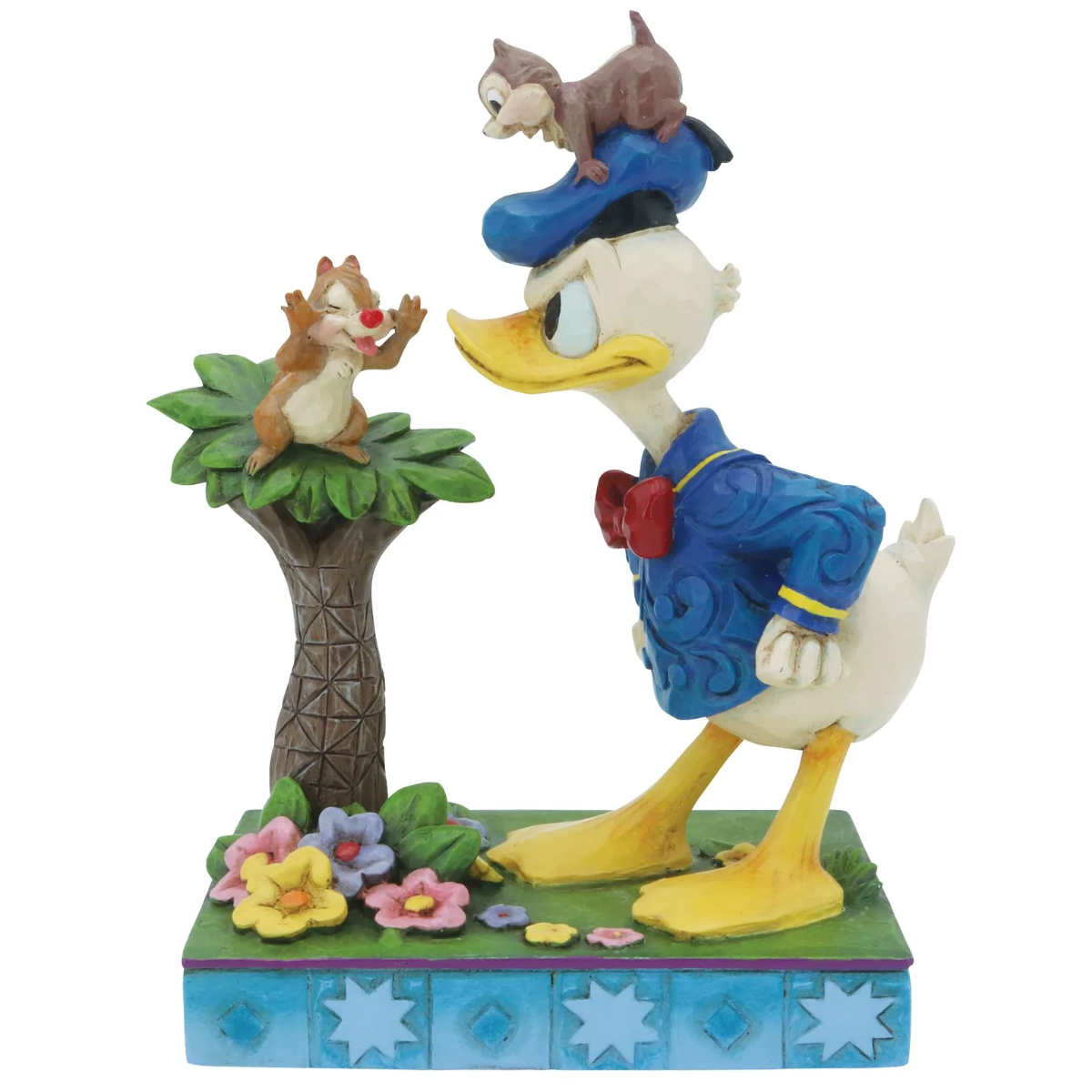 Donald Duck and Chip n Dale Figurine - Disney TraditionsSize : Height 12 cm - width 10 cm - Depth 6 cmResin wood LookAlways causing trouble, the mischievous chipmunk brothers Chip and Dale horseplay with Donald Duck in this playful piece by Jim Shore. lowing a raspberry, one of the chipmunks teases from a branch while the other rides the grumpy duck's head.