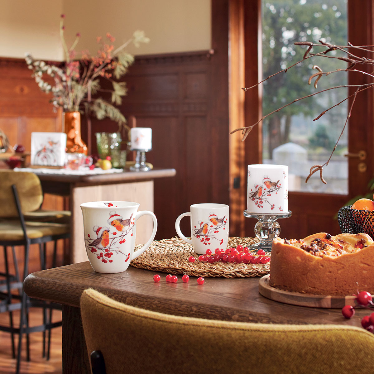 Fine bone china mug 0.40 L – Winter Gnome & Red Berries – AmbienteLarge winter mug featuring a cosy gnome, birds and frosty branches. Perfect for tea, long coffee or hot chocolate.• High-quality fine bone china • Detailed winter illustration • Large 0.40 L capacity • Height 11 cm – Diameter 10 cm • Interior detail with little bird