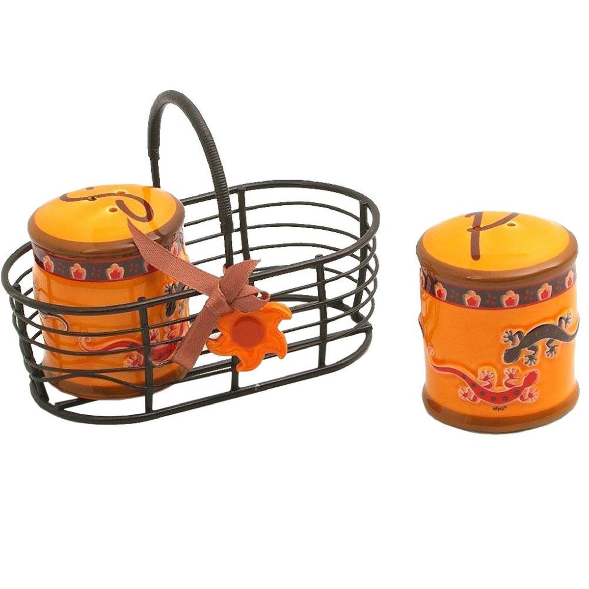 Gekoa and Sun Set Salt and PepperSalt and Pepper CeramicsMetal basketDimensions of the small basket: Height 8.5 cm - width 11 cm - Depth 6.3 cmDimensions salt or pepper shakers: Height 5.5 cm - Diameter 4.5 cm