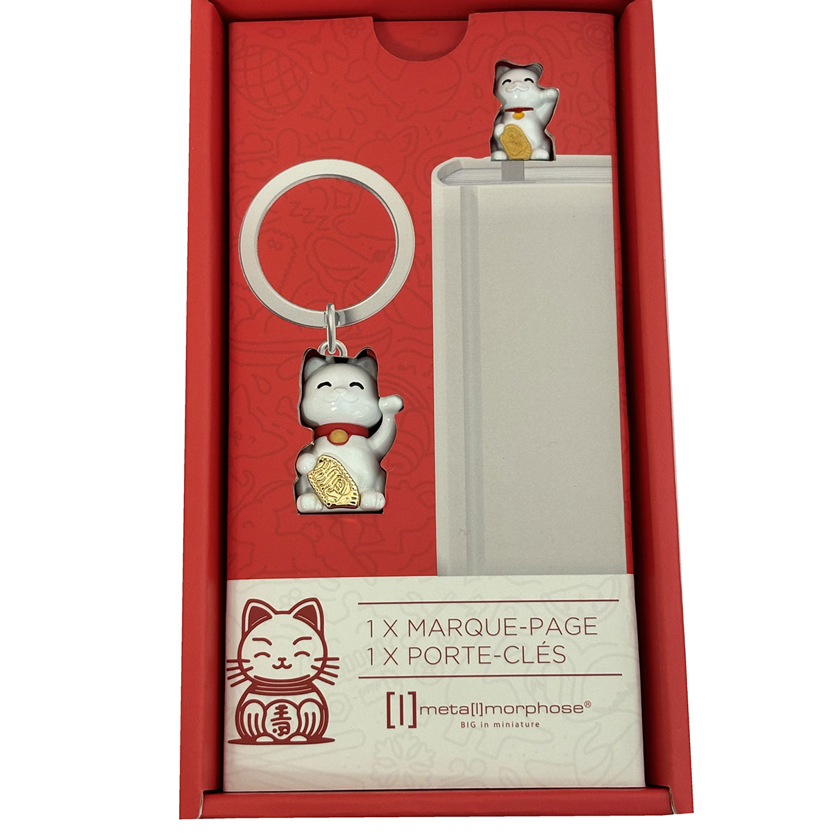 Gift Set Lucky Cat Keychain and BookmarkIn metalBox dimensions: Height 4 cm - Width 9 cm - Depth 16 cmHeight of the cat on the keychain: 3 cmHeight of the cat on the bookmark: 2 cmEach lucky cat, meticulously crafted in metal, embodies joy and positivity. Whether hanging from your keys or adorning your favorite pages, these adorable cats become charming companions.