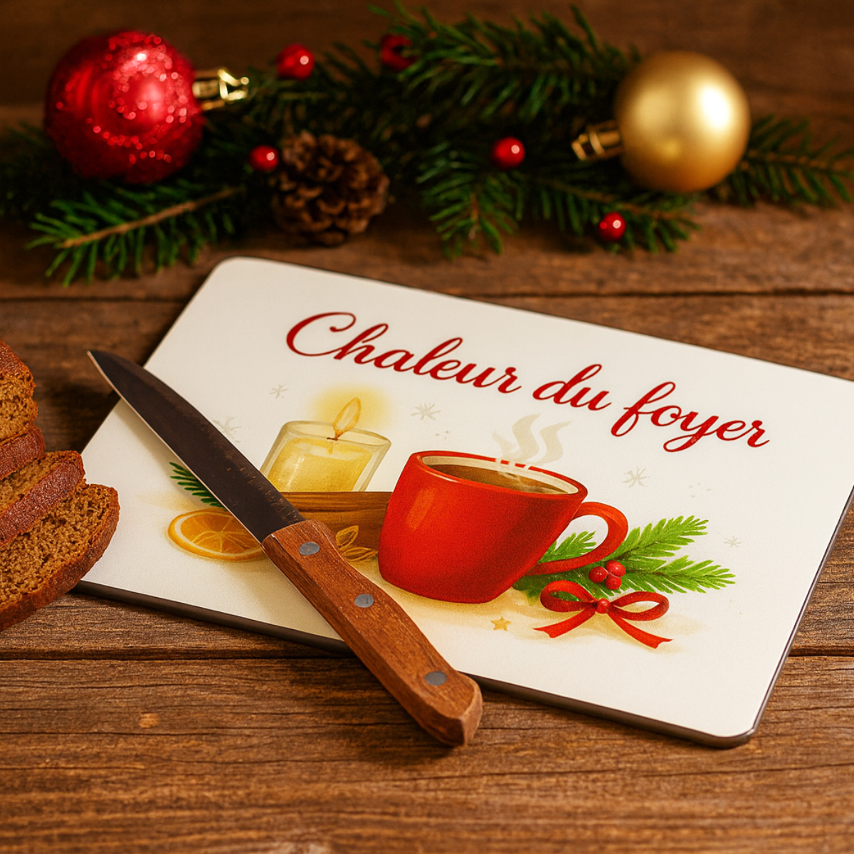 Glass Cutting Board Cozy Home Warmth – CBKréation• Manufacturer: CBKréation• Material: Textured glass• Size: 28.5 × 20 cm• Color: White, red, green and gold• Made in France• Cozy illustration with hot drink and candle• Durable and hygienic textured glass surface• Perfect for cutting, serving or decorating• Bright and crisp French printing• Lovely winter gift idea
