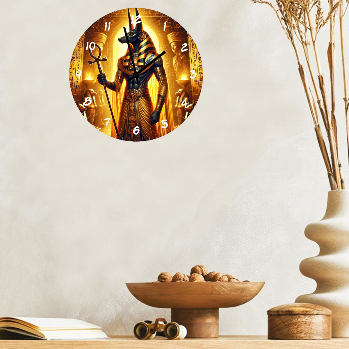Glass wall clock Anubis – mystical golden illustration – decorative wall pieceGlass wall clock featuring Anubis in a golden and mysterious design, perfect for adding a unique and sophisticated touch to any interior.• Detailed Anubis illustration inspired by ancient Egypt• High-quality printed glass with luminous effect• Diameter 29 cm – depth 4 cm• Hanging system included• Works with 1 AA battery (not included)• Printed in France