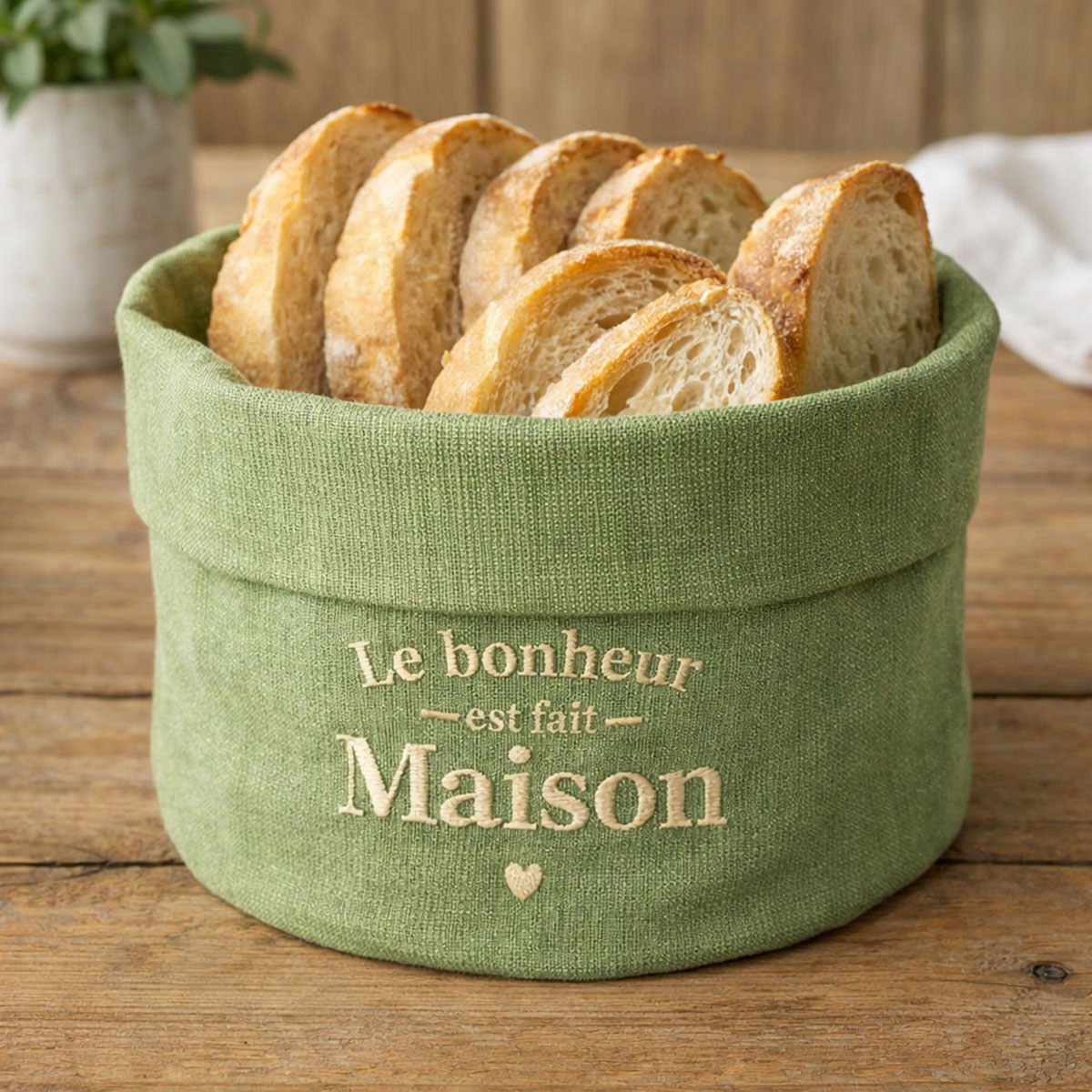 Glitter Bread Basket Embroidered “Happiness Is Homemade” – Green – Gold Embroidery – STC• Glitter embroidered bread basket• Embroidered message “Happiness Is Homemade” in gold thread• Elegant and luminous glitter green colour• Composition: 80% cotton, 20% metallic fibres• Dimensions: height 12 cm – diameter 16.5 cm• Ideal for bread, rolls and pastries• Decorative and functional table accessory• Brand: STCThis glitter embroidered bread basket “Happiness Is Homemade” celebrates simple pleasures and home cooking. The glitter green fabric and gold embroidery add a warm and inspiring touch to the table. A practical accessory, perfect for everyday use or gifting.
