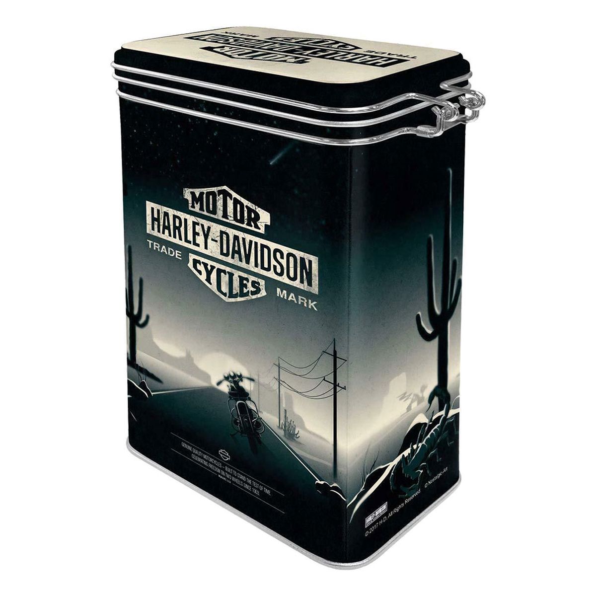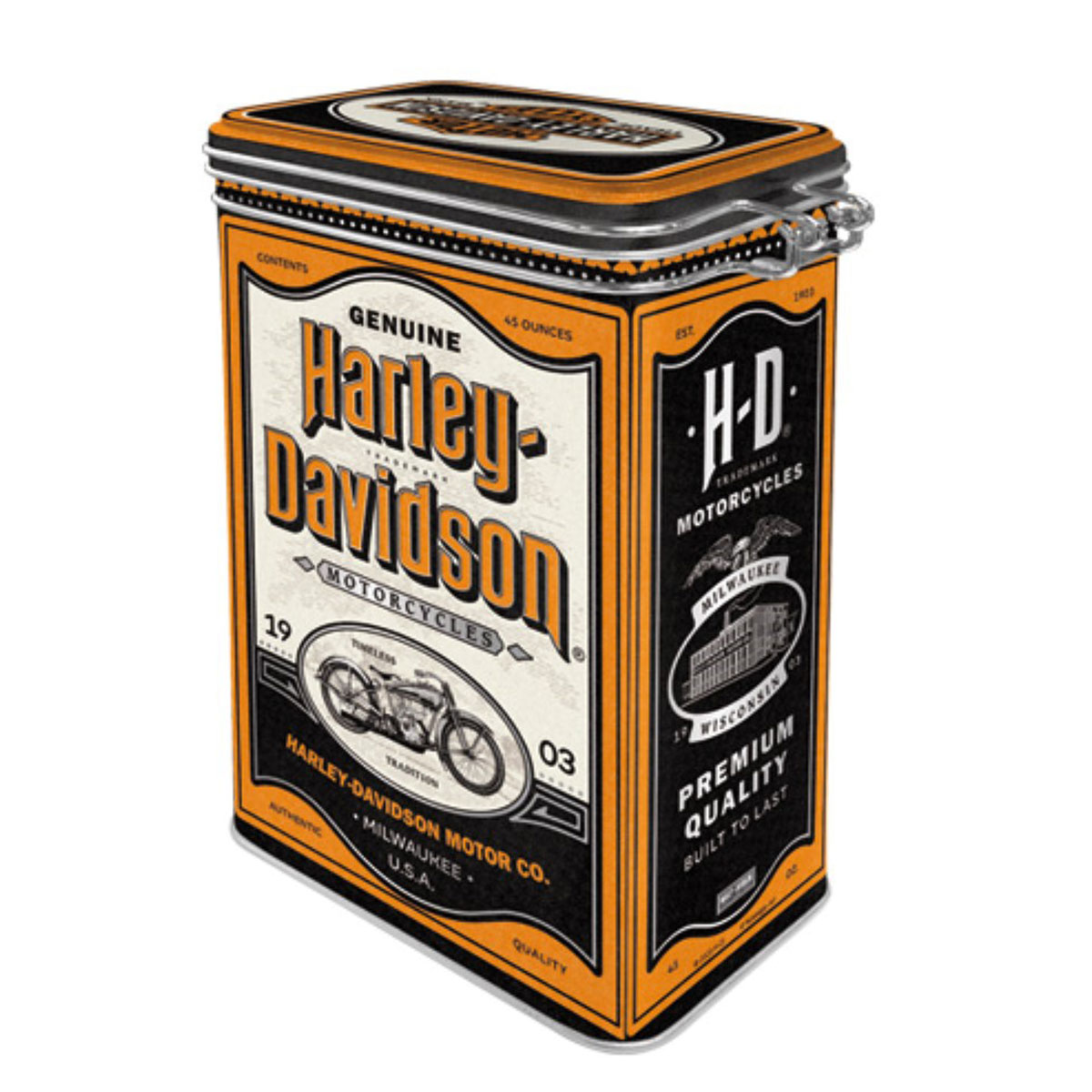 Harley-Davidson Airtight Tin – Nostalgic-ArtAdd a bold biker and vintage touch to your kitchen or coffee corner with this metal storage tin featuring an official Harley-Davidson design.- Manufacturer: Nostalgic-Art- Material: robust metal- Airtight clip closure- Size: 17.5 × 11 × 7.5 cm- Official Harley-Davidson artwork- Ideal for coffee, tea or decorative use