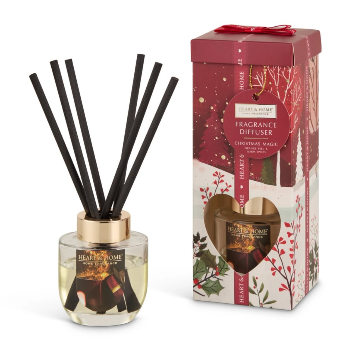 Heart and Home Reed Diffuser - Christmas Magic Scent: Christmas Magic - Top Notes: orange peels, lemon - Heart Notes: nutmeg, cinnamon - Base Notes: tonka bean, orange blossom Sticks: wooden Container: glass Capacity: 70 ml Gift Box: included Fragrance Duration: up to 12 weeksCreate a festive and warm atmosphere in your home with this reed diffuser, perfect for celebrating the magic of the holidays.