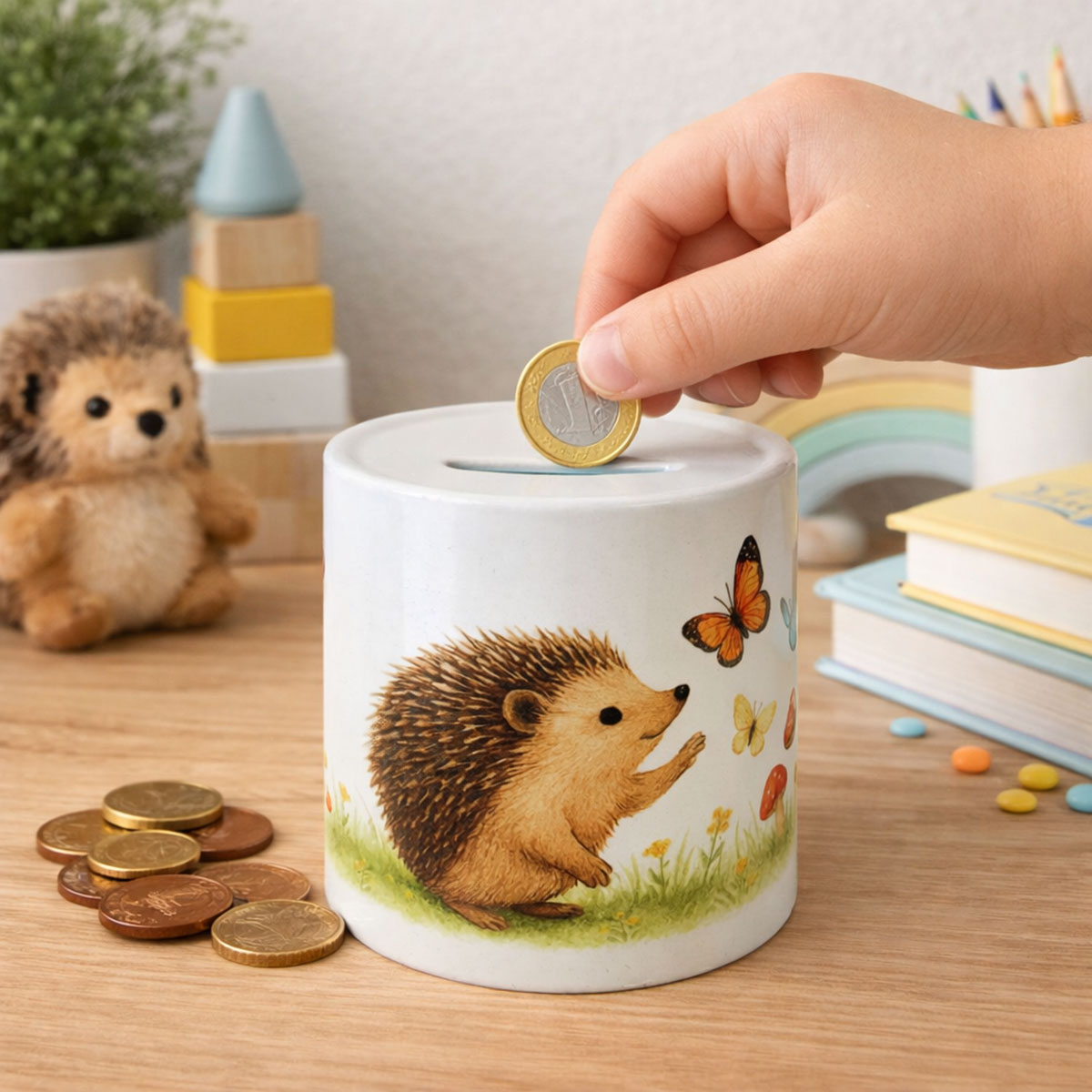 Hedgehog money box for kids ceramic 9.5 cm with stopper – Printed in France – Nursery decoration – CBKréation• Brand: CBKréation • Material: Glossy ceramic • Size: Height 9.5 cm × Diameter 8 cm • Opening: Removable stopper on the bottom for easy access to savings • Use: Decorative coin bank for nursery or children’s bedroom – Perfect gift idea • Printed in France This ceramic hedgehog money box helps children learn to save money in a fun and decorative way. The coin slot on the top allows coins and small notes to be inserted easily, while the removable stopper underneath makes it simple to collect the savings without breaking the money box. Its soft and nature-inspired design makes it a charming decorative piece for shelves, dressers or desks.
