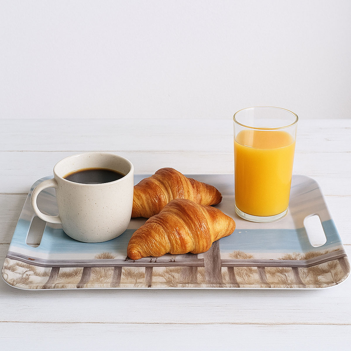 Large Rectangular Tray Blue – Seagulls on the Quay Pattern Dimensions: Width 46.5 cm x Depth 32.5 cm Material: Melamine Let yourself be swept away by the marine breeze with the Large Rectangular Blue Tray adorned with the Seagulls on the Quay motif. Inspired by the fresh breeze of the shoreline and the tranquility of the docks, this tray evokes freedom and the sweet way of life by the sea. Its generous size makes it an ideal companion for your moments of relaxation: a breakfast on the terrace, an afternoon snack in the sun, or an aperitif by the sea.Made from melamine, this tray combines lightness, durability, and ease of maintenance, offering a practical and stylish solution for serving drinks and snacks. Its marine design, with seagulls flying and the blue horizon, adds a touch of escapism and freshness to your meals. Versatile and refined, it becomes an essential accessory to create a summery and convivial atmosphere, wherever you are.