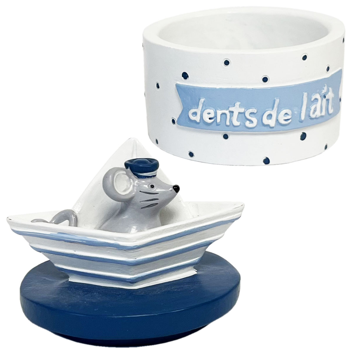 The Little Tooth Fairy Box Mouse Little Sailor is an adorable accessory, perfect for storing young children's baby teeth. Made from resin, this box features a charming design with a little mouse in a small boat, in fresh white and blue colors. This box ensures safe storage of baby teeth, creating a precious childhood keepsake.