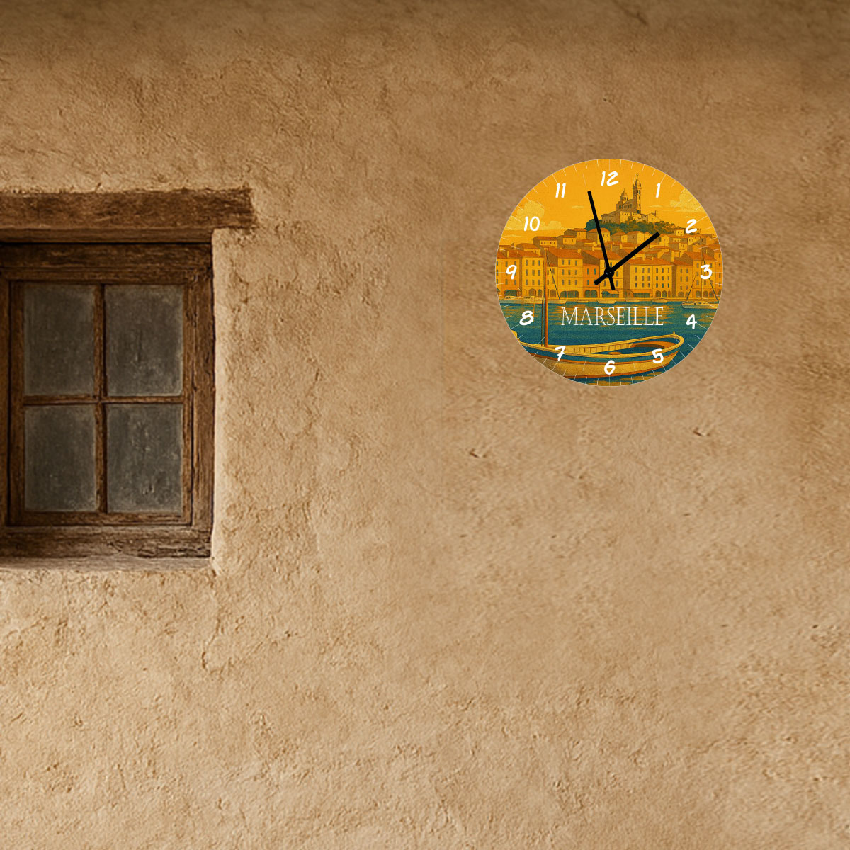 Marseille wall clock 29 cm – vintage Mediterranean illustration – glass decorative clock – Vieux-Port design – AA batteryBring warm Mediterranean charm to your home with this vintage-style Marseille wall clock featuring the iconic Vieux-Port.• Vintage Marseille illustration with warm coastal tones• High-quality glass print with vivid colours• 29 cm diameter, ideal for living room, kitchen or hallway• Easy to hang with included hook and silent mechanism• Powered by 1 AA battery (not included)