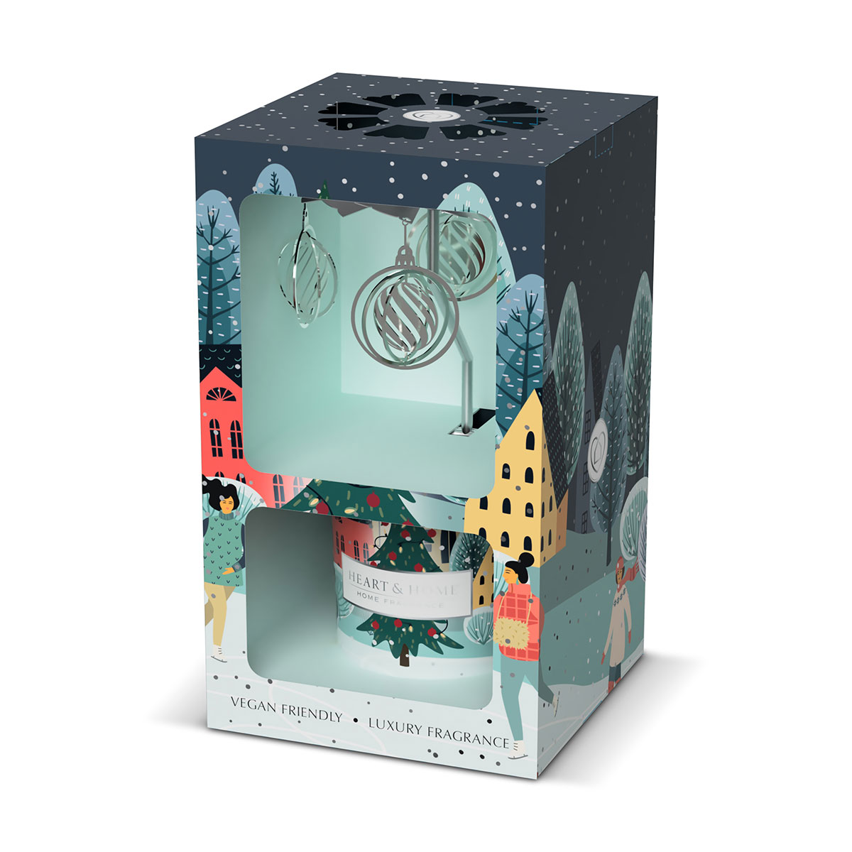 Mini candle enchanted baubles & carousel – Heart and Home Bring a magical touch to your evenings with this gift set combining a Boules Enchantées scented mini candle and a decorative metal carousel. When lit, the flame makes the Christmas baubles charms spin, creating a mesmerizing play of light while releasing a warm festive fragrance. A rich and enchanting fragrance • Top notes: sparkling citrus • Heart notes: winter red berries • Base notes: soft fruity accords Features: • Brand: Heart and Home • Collection: Enchanted Baubles – Winter berries & citrus • Format: mini candle 45 g + decorative carousel • Burn time: up to 15 h • Wax: natural soy wax, vegan & sustainable • Composition: cotton wick, reusable glass jar, metal carousel • Design: Christmas bauble charms hanging from the carousel Ingredients: ⚠️ May cause skin allergy. If on skin: wash thoroughly with soap and water. Dispose of contents/container in accordance with local regulations. Contains: Linalool, Citral, Eugenol, Linalyl acetate, d-Limonene, etc. May cause an allergic reaction.