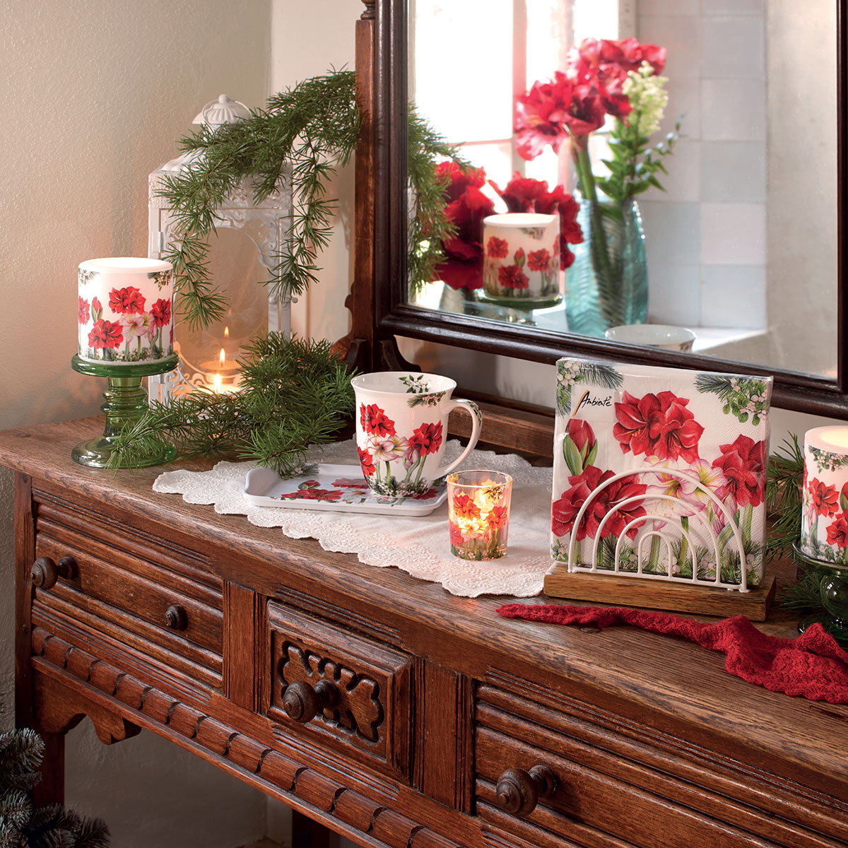 Mini tray – Red amaryllis – Ambiente A beautiful floral tray featuring bright red and pink amaryllis flowers. Perfect for serving or as an elegant home accessory. • brand Ambiente • glossy melamine material • 20.5 × 13.5 cm • hand wash recommended
