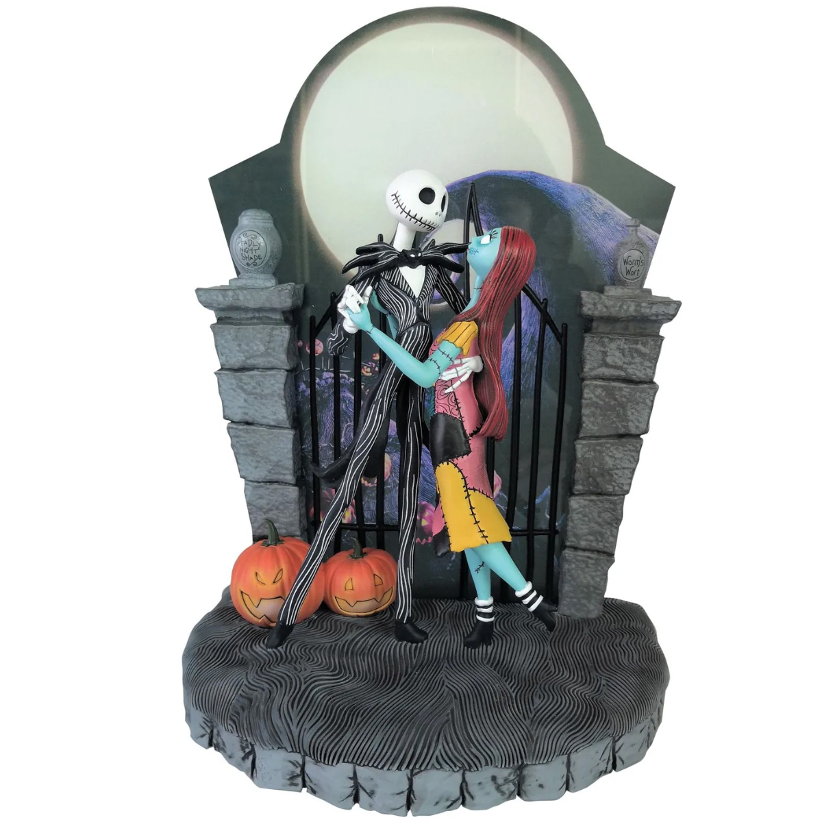 Nightmare Before Christmas Luminous FigurineHeight 26 cm - Width 18 cm - Depth 11.5 cmA lit up halloween moon forms the back drop of this endearing scene from The Nightmare Before Christmas. Jack and Sally's graveyard waltz is frozen in time with only jack-o-lanterns as their witnesses. The figurine is made from cast stone. Each piece is hand painted and slight colour variations are to be expected which makes each piece unique. Supplied in branded gift box. Not a toy or children's product. Intended for adults only. 3x AAA batteries required - Not included