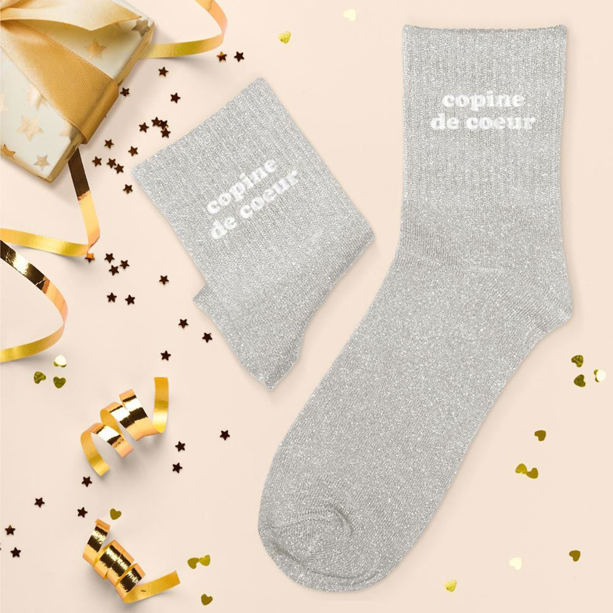 Pair of Glitter Socks - Heart Friend Gray Color: Elegant gray with shimmering patterns for a touch of glamour. Material: 55% cotton for comfort, 32% polyester for durability, and 11% metallic fiber for an irresistible shine. Size: One size fits shoe sizes 36 to 42.Perfect socks to brighten your days and share a moment of friendship with your besties!