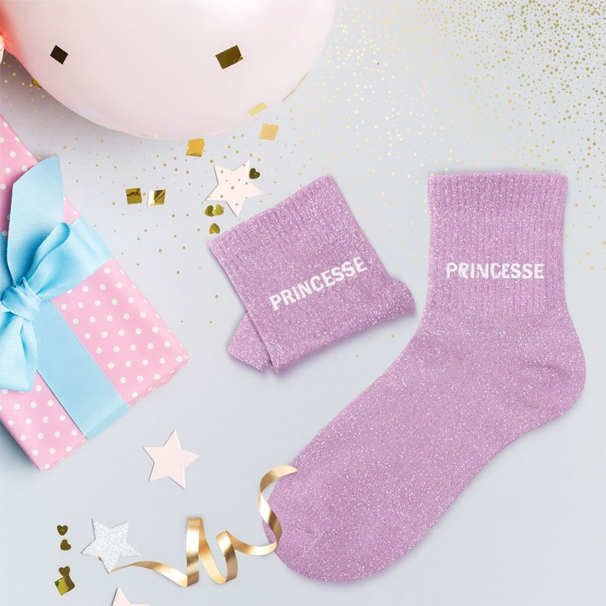 Pink “Princess” Glitter Socks- Colour: Pink with shimmering details- Material: 55% cotton, 32% polyester, 11% metallic fibre- Size: One size (EU 36-42)- Soft and comfortable socks with “Princess” text woven in white- Subtle glitter for a feminine and fun touch- Perfect mix of comfort and style for everyday wear- Great gift idea for someone who loves sparkle
