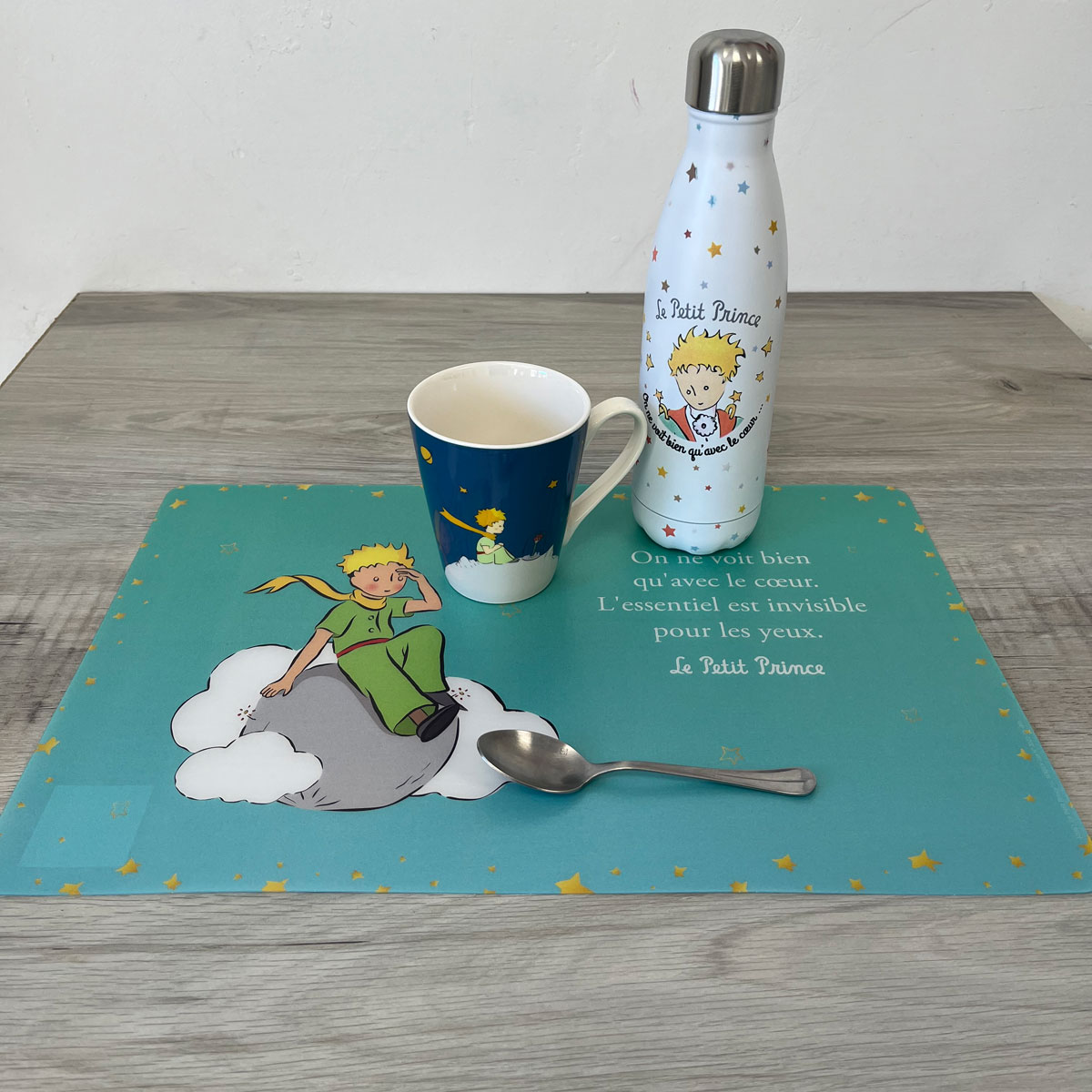 Table Mat The Little Prince on a Cloud – Blue and Green – 43 cmMaterial : PolypropyleneDimensions : Width 43 cm x Height 28 cmDominant color : Blue and GreenCollection : The Little Prince by Saint-ExupéryAdd a magical touch to your table with this table mat illustrated by The Little Prince floating on a cloud. Made of high-quality polypropylene, it is sturdy, easy to clean, and protects your table with elegance. Perfect for admirers of this timeless tale, this mat combines poetry and functionality, creating a soft and inspiring atmosphere.