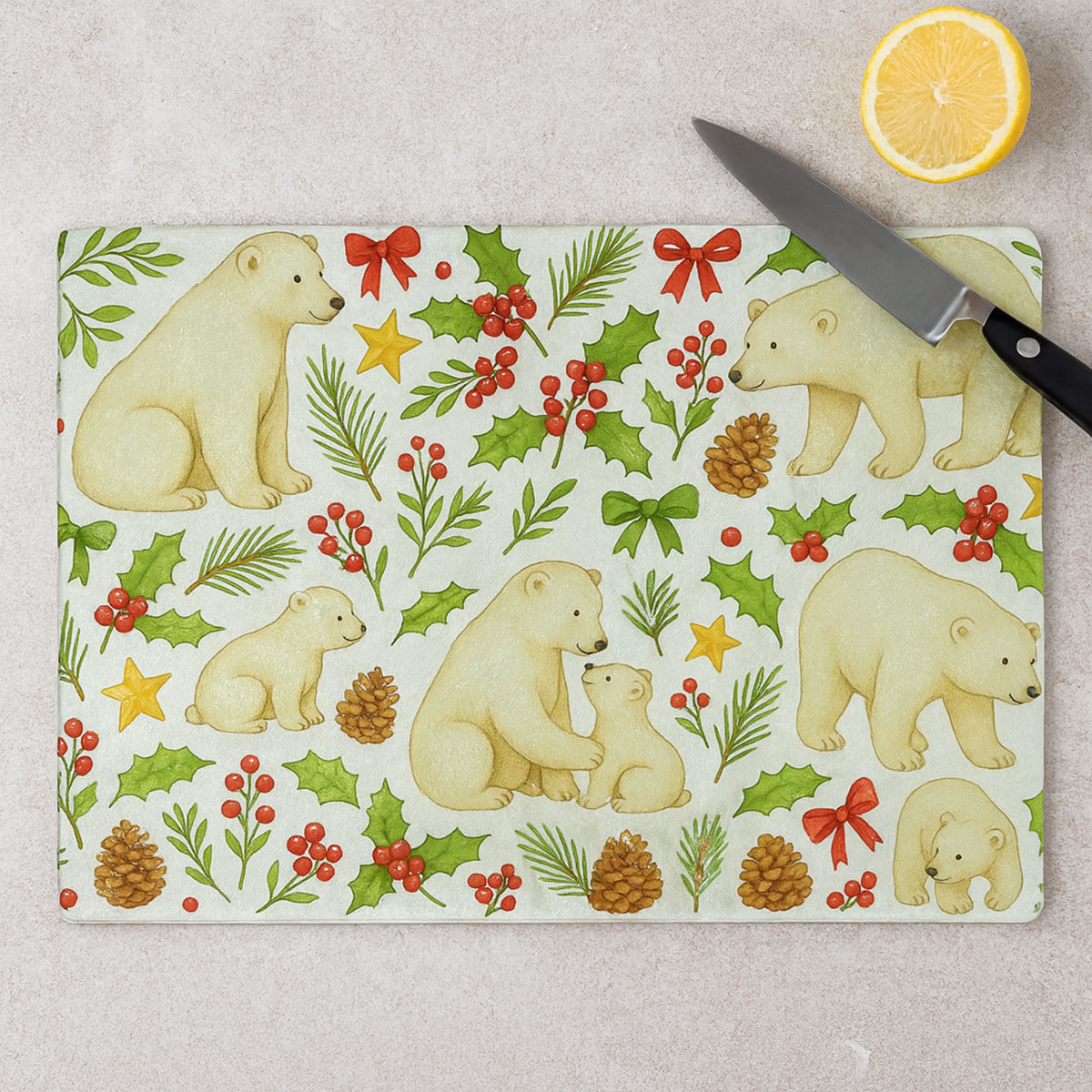 Polar Bears Glass Cutting Board – Frosted GlassBring a festive and cozy touch to your kitchen with this frosted glass cutting board, decorated with sweet polar bears among holly branches, pinecones, and golden stars. Strong and hygienic, it offers an ideal surface for preparing your daily ingredients.Versatile, it can also be used as a stylish serving tray for your holiday appetizers and treats, adding a decorative and convivial note to your table.Features:• Material: frosted glass• Size: Width 28.5 cm × Depth 20 cm• Printed in France