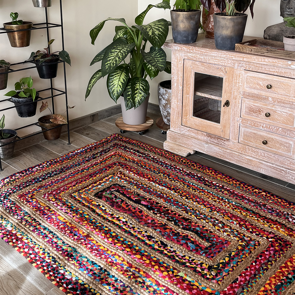 Rectangular Rug 180 x 120 cmMaterials: Jute and CottonMade of natural fibersDimensions: 180 x 120 cmThe multicolored rectangular rug measuring 180 x 120 cm is a remarkable piece that adds warmth and style to any space. Crafted from jute and cotton, this rug skillfully combines the natural durability of these fibers with the beauty and diversity of colors.