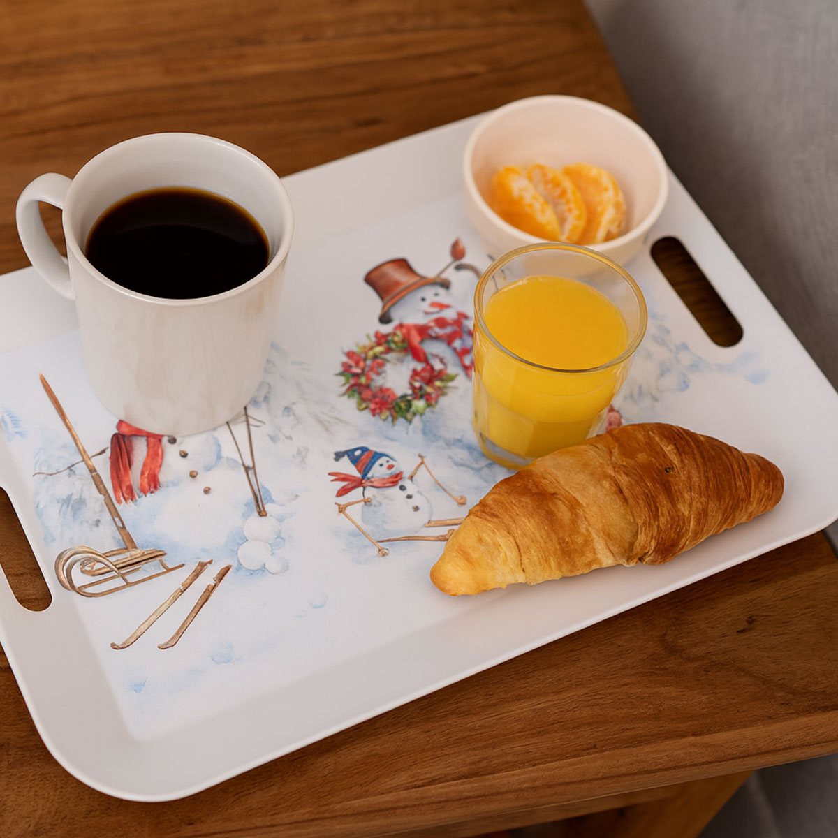Rectangular tray snowman family – 46.5 x 32.5 cm Material: Melamine Dimensions: Width 46.5 cm x Depth 32.5 cmA festive spirit full of tenderness This large melamine tray features a joyful snowman family in a gentle winter landscape: sleds, skis, snowball fights, and snow-covered trees evoke the magic of the winter holidays. Its poetic and childlike illustration adds a warm touch to your shared moments.Equipped with two integrated handles for easy carrying, this tray is ideal for serving a festive snack, breakfast, or hot drinks by the fire. Practical, lightweight, and durable, it combines charm with everyday functionality.