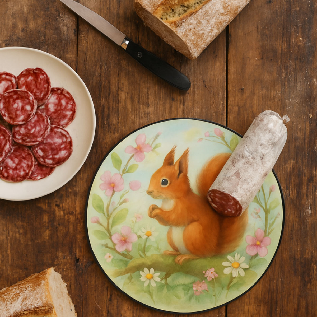 Round glass cutting board – Squirrel design – 30 cm – CBKréation• Soft and poetic squirrel illustration, bringing a natural and cozy touch to the kitchen• Durable and hygienic glass surface, ideal for cutting or use as a trivet• Made in France with high-quality printing and long-lasting colors• Large round format 30 × 30 cm, both practical and decorative• Ideal gift idea for nature lovers and kitchen decor enthusiastsThis round glass cutting board features a delicate squirrel illustration in soft pastel tones. Practical and decorative, it protects the worktop while adding a gentle natural atmosphere to the kitchen. Heat-resistant, easy to clean and versatile, it can be used as a cutting board or decorative trivet. A refined creation by CBKréation, printed in France.