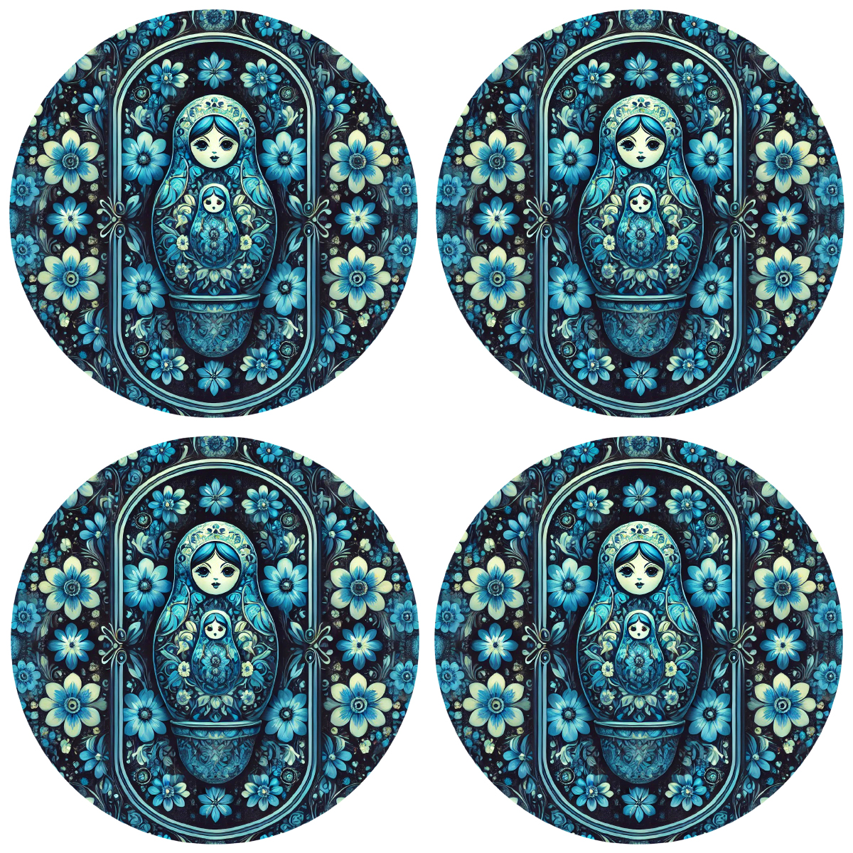 Set of 4 Russian dolls Coasters by CbkreationQuality Material: Made from durable fiber, these coasters offer excellent wear resistance while being lightweight and easy to handle.Each coaster measures approximately 9.5 cm x 9.5 cm, an ideal size to accommodate various types of glasses and cups. Their round shape optimizes the protection area, ensuring effective coverage against spills and marks.