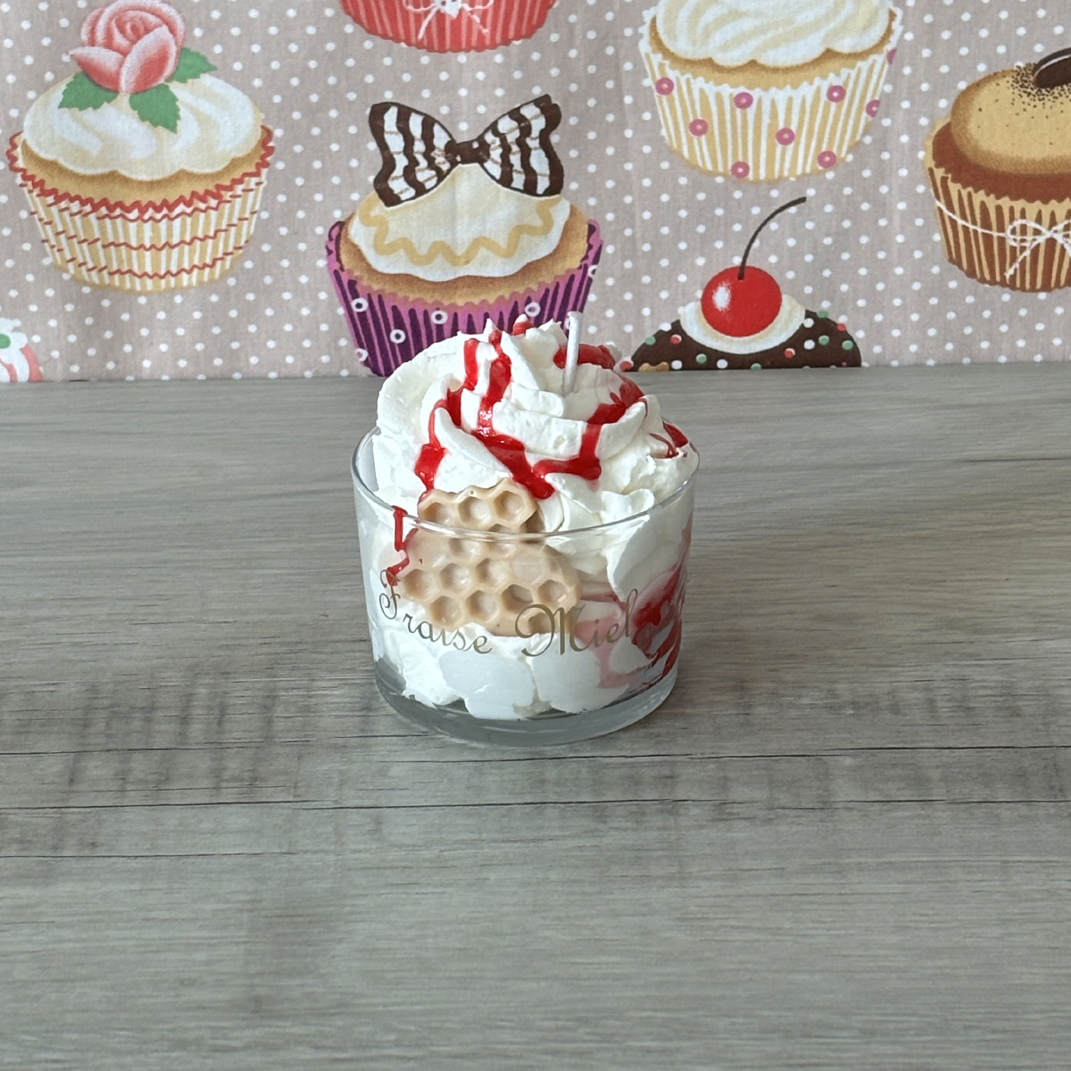 Scented candle with strawberry and honey foam made in ProvenceHandmade in the South of France, in Bormes les MimosasScent: strawberry and honey100% vegetable waxCotton wickReusable glass containerPerfumes from GrasseDimensions: Height 6 cm - Diameter 7 cmWeight: 100 gramsNon-edible candle. Keep away from children.Feel free to recenter and trim the wick if necessary (1 cm). Before burning the candle, remove sugar decorations, flowers, cinnamon sticks, etc. For generous candles or those without containers, place a dish underneath. Never leave burning unattended