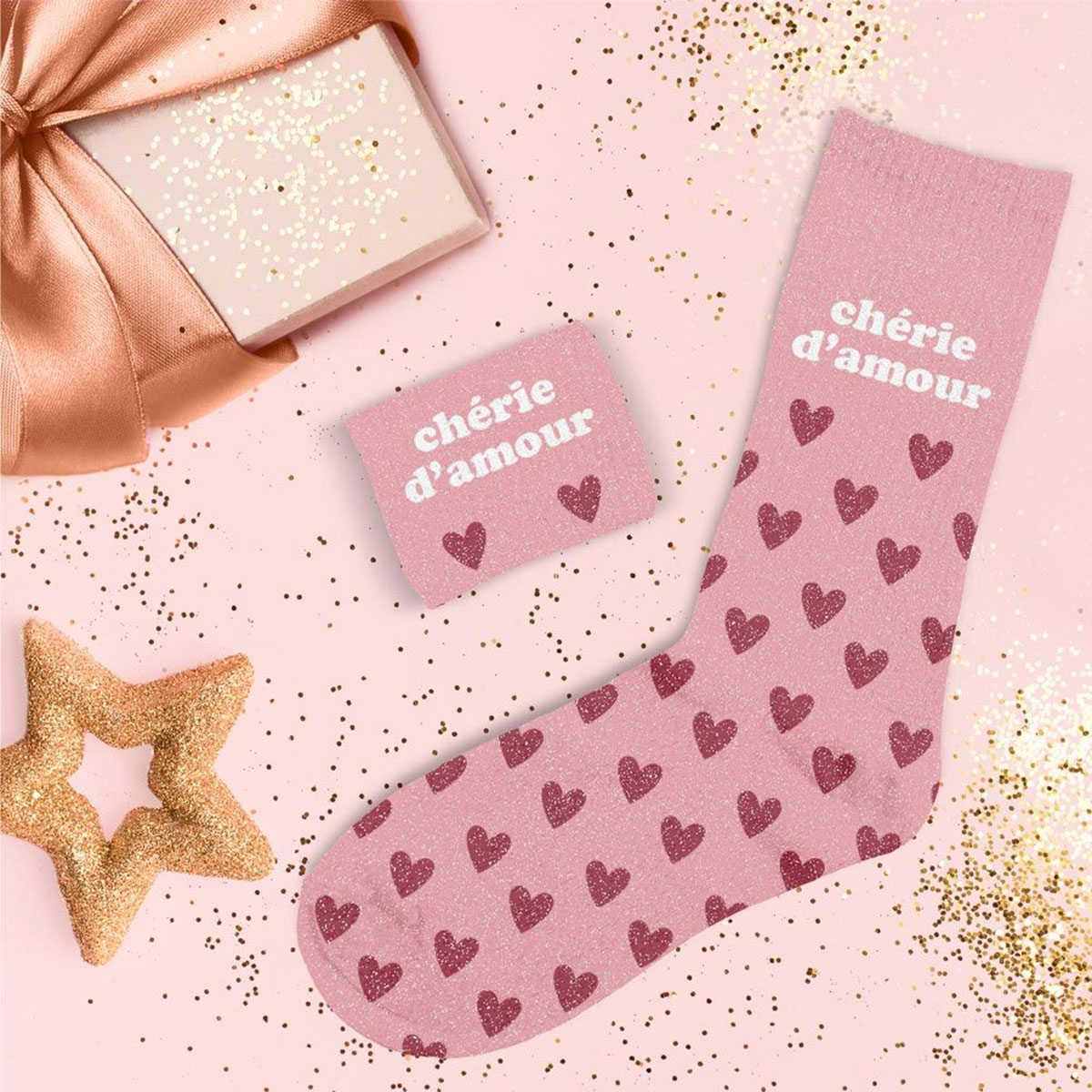 Sparkly Sweetheart Socks color: Pink with dark pink hearts material: 55% cotton, 32% polyester, 11% metallic fiber size: One size (36-42) description: Add a touch of sweetness and romance to your look with these pink sparkly socks, adorned with cute dark pink hearts. A charming and sparkling design that warms your feet while adding a touch of glittering elegance. Perfect for expressing your tender and adorable side!