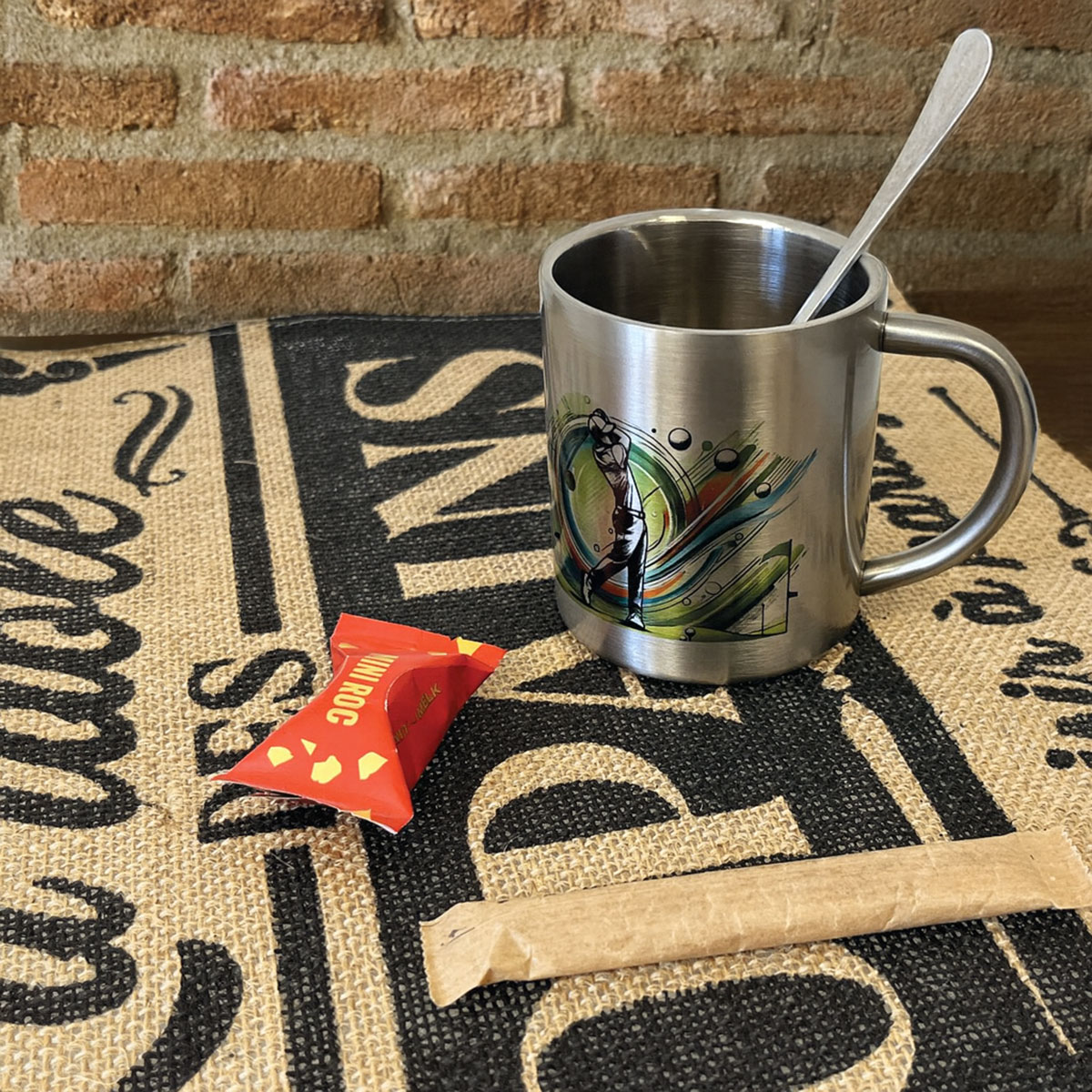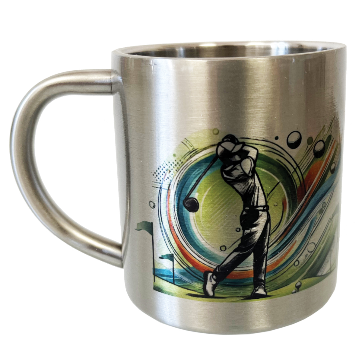 Stainless Steel Double-Wall Mug – Golf Perfect for golf enthusiasts, this stainless steel double-wall mug combines style and practicality. Its dynamic design depicts a golfer in action, ideal for enjoying hot or cold drinks while showing your passion. Features: • Size: Height 8 cm × Diameter 7 cm • Capacity: 200 ml • Material: stainless steel – double-wall insulation • Printed in France