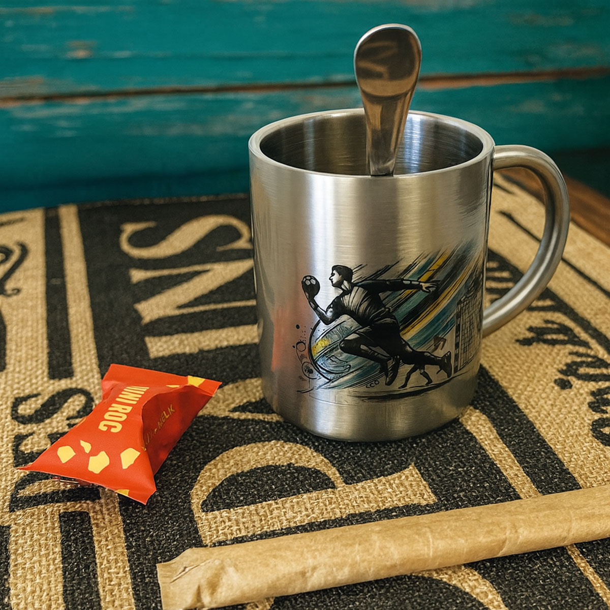 Stainless Steel Double-Wall Mug – Handball This stainless steel double-wall mug is perfect for handball enthusiasts. Its sporty design highlights a goalkeeper in action, making it ideal for enjoying hot or cold drinks every day. Features: • Size: Height 8 cm × Diameter 7 cm • Capacity: 200 ml • Material: stainless steel – double-wall insulation • Printed in France